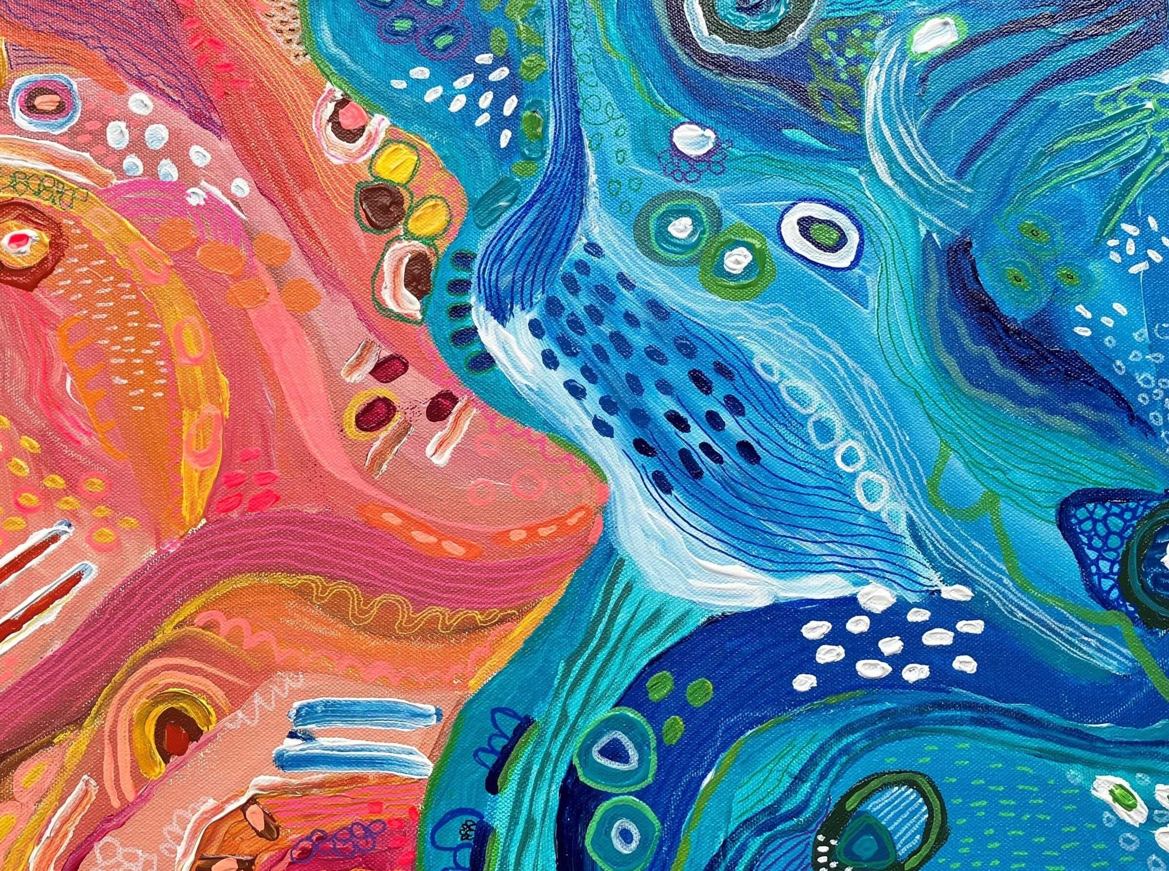 My husband, Bob, now frames my paintings with cypress wood harvested from trees we planted on our farm—another step toward sustainability and self-sufficiency. My work often explores the interface between freedom and control. I've come to realise that whether you're a child or an adult—navigating politics, religion, society, or any life journey—freedom almost always comes with rules. I begin with geometric shapes, using brush and pencil to explore variations in hue and line. Often, I use a grid to introduce structure and bring order for the viewer. Finally, expressive, handmade brushmarks add energy, spontaneity, and life to the work.