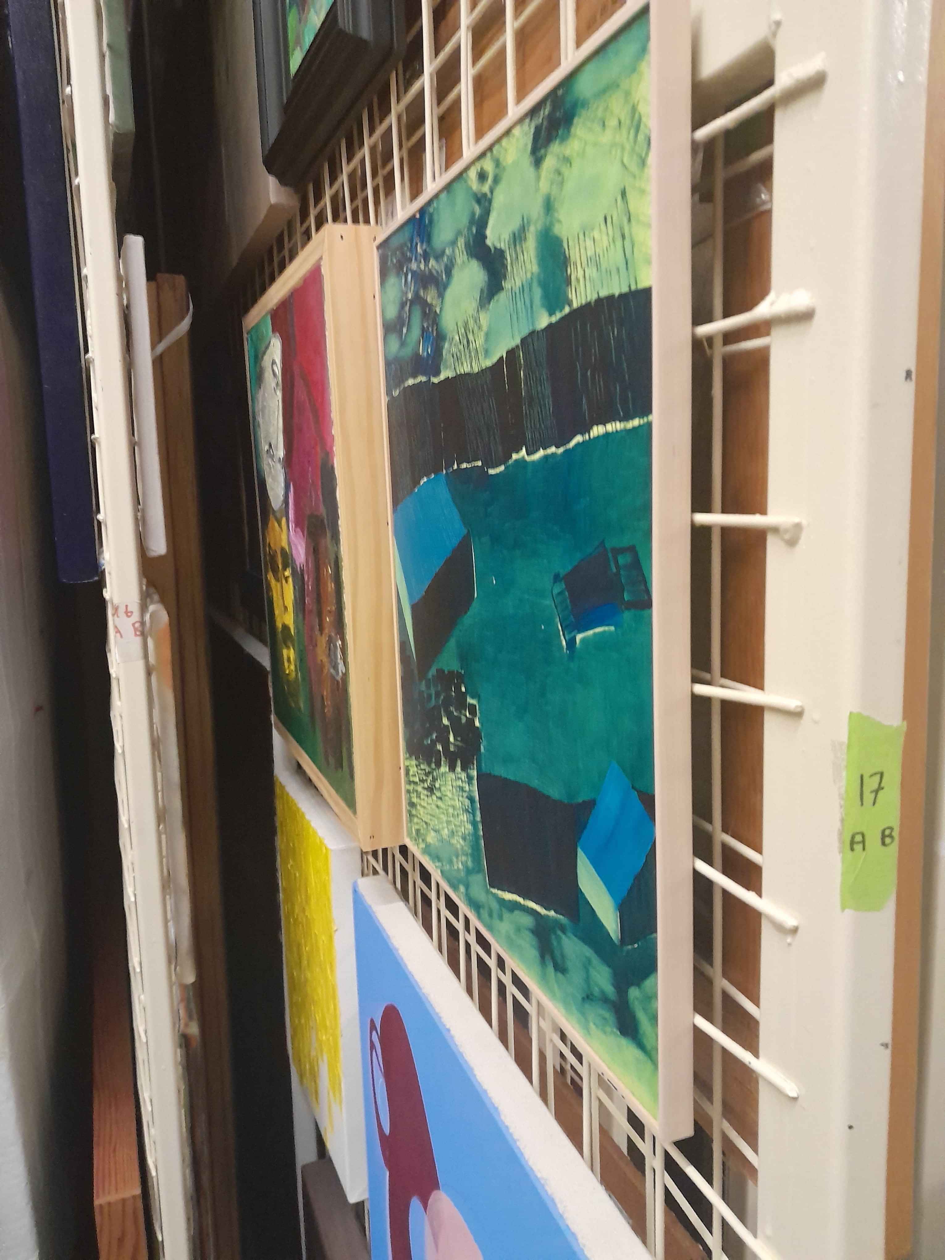 The artworks in the collection are not stored in a particular order on the racks. They were placed as space allowed and their location is then recorded in the Trust’s database. The works in Rack 17A, Rack 22A, Rack 26A are displayed in a similarly jumbled manner. This sense of ‘disorder’ often forms part of our daily lived and online experience. We may encounter many things simultaneously like images appearing from all directions. It can be a jarring experience. But over-saturation can result from actions we make and be positive and personal. Our consumption of music is such an instance. In times past we made mix tapes, set our iPods on shuffle and now we have streaming services such as Spotify.