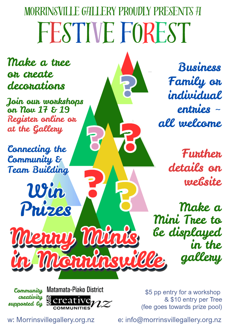 To help participants get started or refine ideas Morrinsville Gallery is hosting two tutored Mini Tree Makers and Decorators Workshops in November. Book early as we have limited spaces.